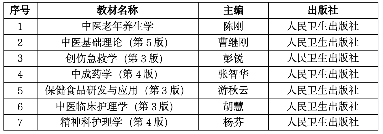 本网讯 近日,人民卫生出版社公布国家卫生健康委员会“十五五”规划教材暨第五轮全国高等学校中医药教育(本科)规划教材主编、副主编立项结果。我校《中医老年养生学》《中医基础理论》等7种教材获主编立项,另有21种教材获副主编立项。