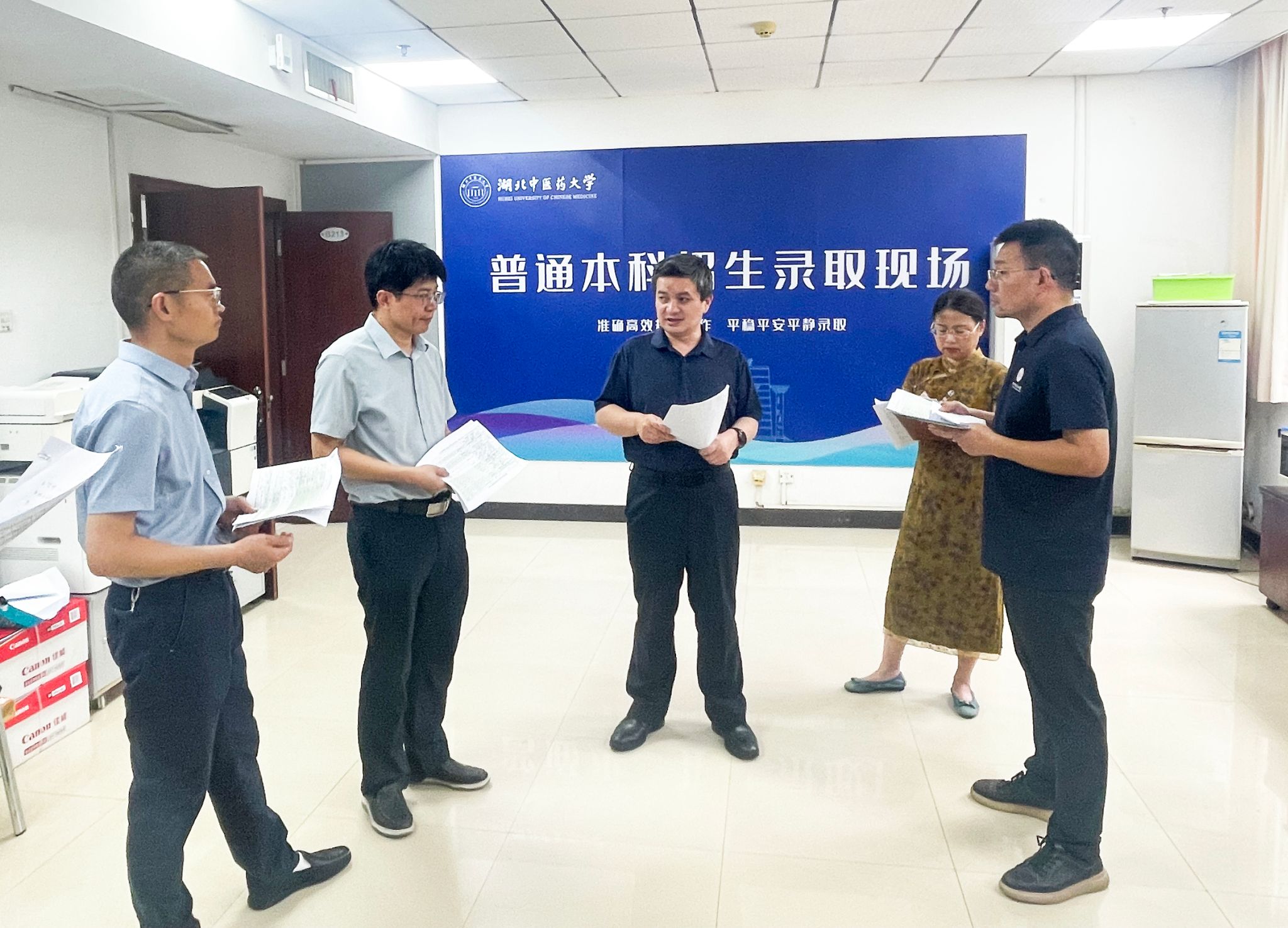 在招生录取现场,校领导听取了招生办公室关于今年录取情况的总体汇报,详细了解当前的录取进度以及阶段性录取成果,实地查看了阅档、审核、数据管理及考生咨询服务等环节运行情况。