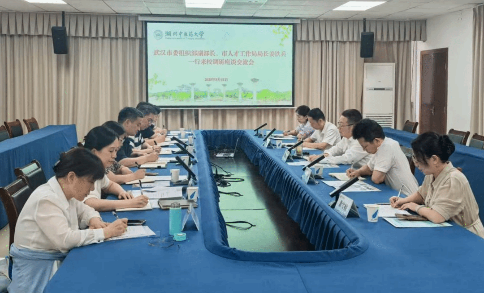 本网讯 8月11日,武汉市委组织部副部长、市人才工作局局长姜铁兵一行来校调研。党委书记刘松林,副校长刘建忠,党委副书记、副校长蔡晓英出席调研座谈会。座谈会由刘建忠主持。