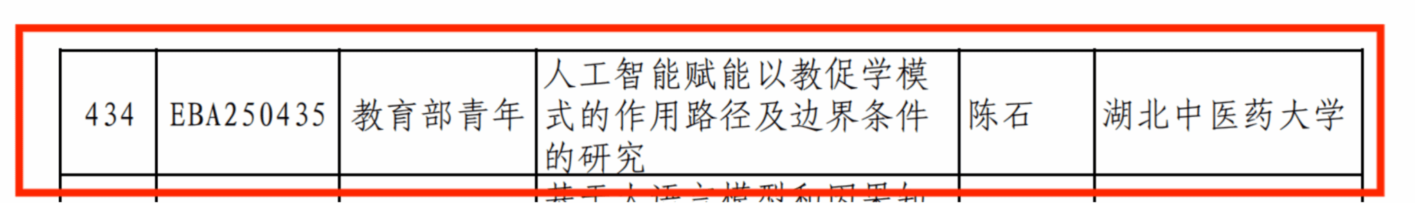 本网讯 近日,全国教育科学规划领导小组办公室公布2025年度课题立项结果,我校医学人文学院陈石博士团队主持的“人工智能赋能以教促学模式的作用路径及边界条件的研究”项目成功获批全国教育科学规划部级青年项目。项目聚焦AI技术与教育教学的深度融合,针对传统模式中资源依赖性强、个性化不足、评价滞后等问题,探索人工智能赋能以教促学的智能教学生态模式。