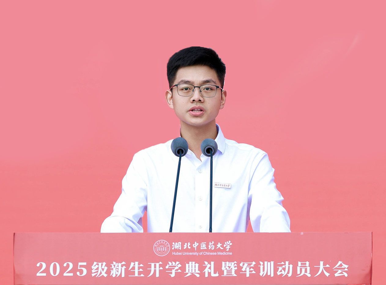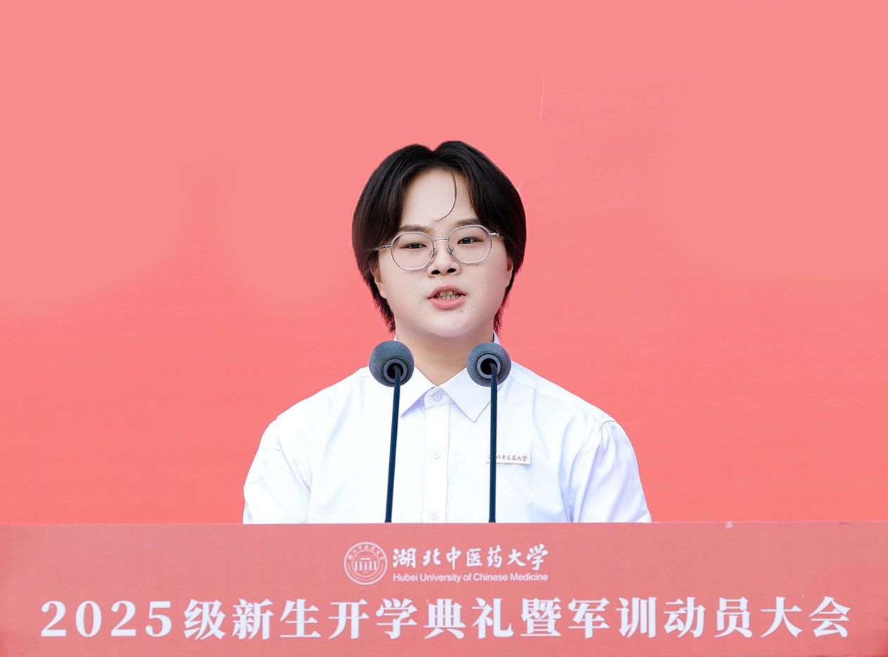 研究生新生代表、国家奖学金、李时珍中医药教育基金奖学金获得者、药学院2025级博士研究生肖扬鑫发言,用三个“立”字与新生共勉。