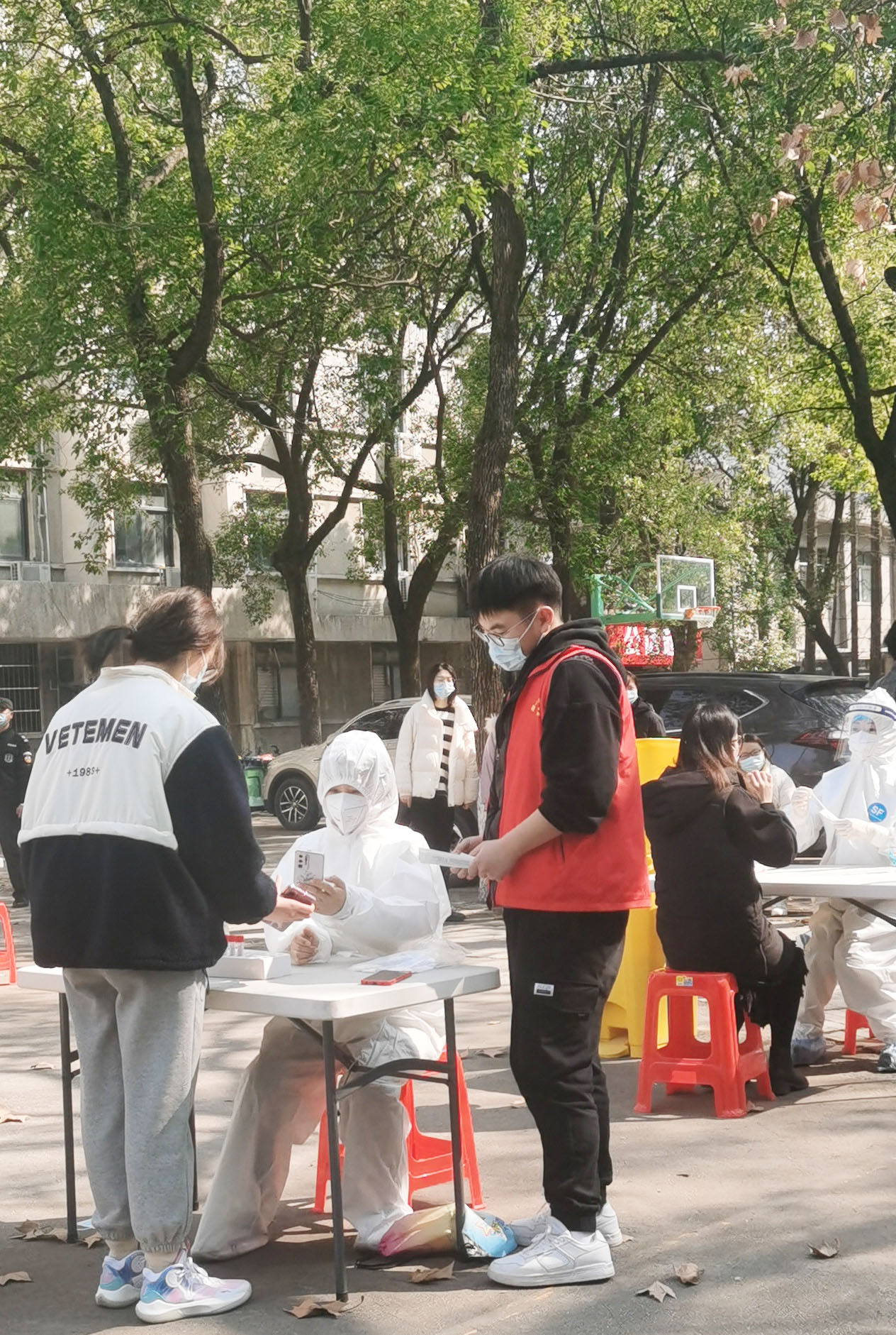 “有序排队,分开一米站,请大家打开手机微信健康码扫我手上的二维码,保持良好的秩序,等待核酸检测……”志愿者岳非凡同学向核酸检测人群中说道。在黄家湖校区图书馆广场,从早上7点半到晚上的6点半,100余名志愿者们以饱满的热情和积极的状态引导学生有序排队,扫健康码,顺利完成核酸检测工作。