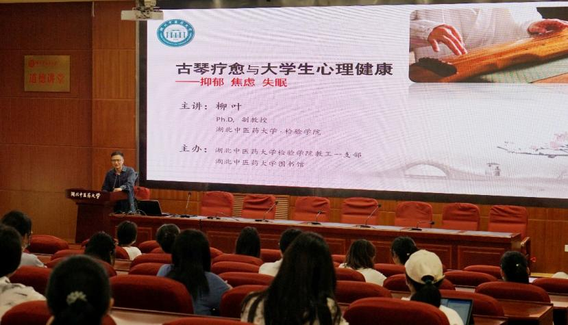 本网讯 近日,检验学院教工一支部与图书馆在黄家湖校区图书馆学术报告厅联合举办“文化自信视域下的古琴”系列讲座。检验学院副教授柳叶老师作题为“古琴疗愈与大学生心理健康——抑郁 焦虑 失眠” 的讲座,图书馆副研究馆员刘英杰主持讲座。图书馆负责人、相关负责人,检验学院教工一支部书记以及学生代表聆听讲座。