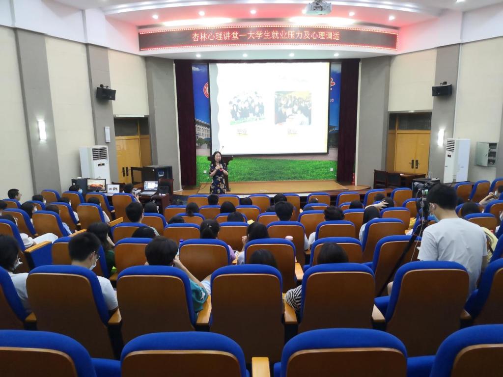 本次讲座邀请了中国心理学会注册心理师、武汉交通职业学院心理中心专职教师郭敏慧老师主讲,主题为“青春不迷茫,人生再起航——大学生就业压力及心理调适”。郭敏慧老师以就业形势为切入点,详细介绍了当前大学生就业的基本情况,从工作与选择、工作与幸福、工作与人生三个方面阐释了在择业就业的过程中,如何选择正确的职业方向,实现人生价值。现场,郭敏慧老师介绍了沟通的方法,通过理论分析与个案解析相结合的方式向同学们展示了大学生在就业方面可能存在的心理压力及其应对方法。最后,郭敏慧老师通过情景模拟的形式,引导学生正确认识可能遇到的心理困境,在积极应对挑战的同时,迎接人生新阶段的到来。