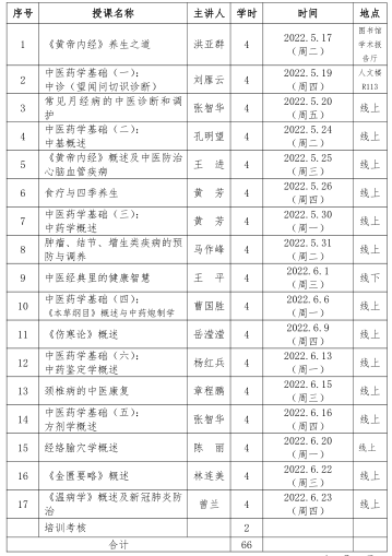 “非学中”培训班于5月17日正式开班,历时一个多月,共邀请相关专家17人,讲授专题17场次,累计60余学时。培训班主要面向学校现职在岗非中医药类学术背景的专职教师、科研人员、教辅人员,课程内容包括中医药基础知识和“四大经典”(内经、伤寒、金匮、温病)。培训采取线上和线下相结合的方式进行,共有187位教师报名培训班。