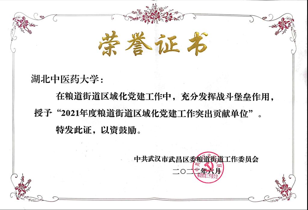 本网讯 7月1日,武昌区粮道街道召开区域化党建工作会议,对促进粮道街道区域经济发展和社会服务做出贡献的单位和个人进行表彰,会上共表彰55家先进单位、8个先进团队和90名先进个人。我校获“2021年度粮道街道区域化党建工作突出贡献单位”称号,国医堂殷杰老师获“察民情先锋”荣誉称号。