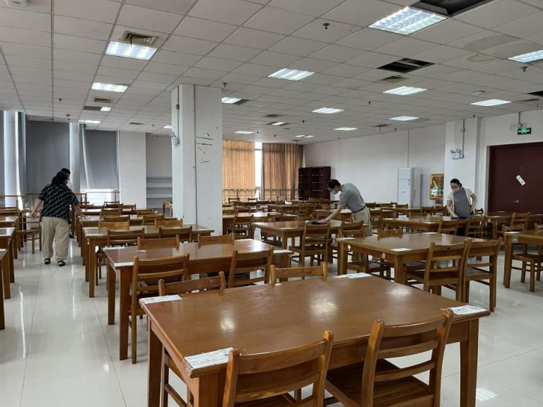 在图书馆负责人、相关负责人的带领下,馆员们对黄家湖校区、昙华林校区阅览室的近3000张桌椅、书架、书柜等进行了全面的清洁消杀。