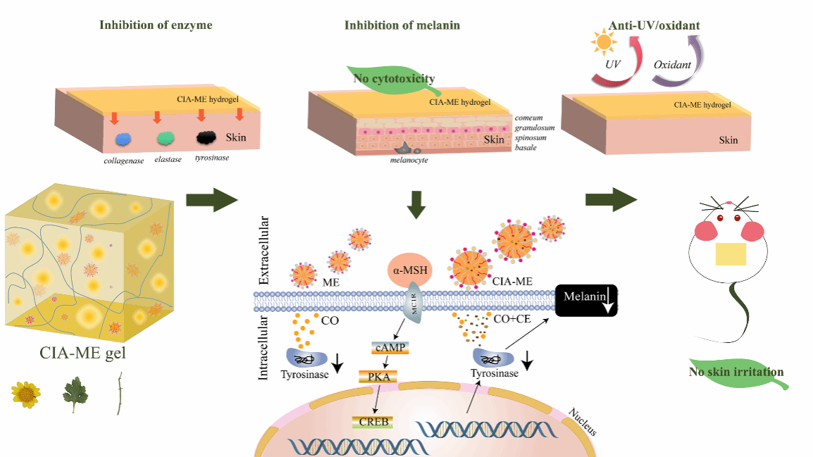 研究团队还进一步对神农香菊微乳凝胶的护肤功效进行了系统评价。含有神农香菊花精油和茎叶提取物的微乳表现出显著的抑制单酚酶和二酚酶的活性,以及抑制胶原酶和弹性酶的活性。此外,神农香菊微乳呈剂量依赖性显著抑制B16F10黑色素瘤细胞内酪氨酸酶活性,减少细胞内黑色素生成。研究还发现神农香菊微乳凝胶具有较高体外防晒系数和广谱防晒能力,对人角质形成细胞HaCaT无毒性,对小鼠皮肤无明显刺激。以上结果表明神农香菊花精油和茎叶提取物具有良好的美白和光保护活性,联合使用制备神农香菊微乳凝胶是发挥抗氧化、美白、抗衰和防晒等护肤作用的更有效途径。
