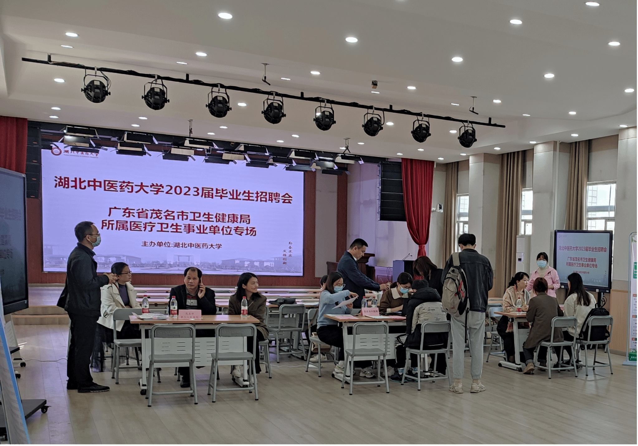本网讯 3月6日,学校联合广东省茂名市卫生健康局在昙华林校区举办专场招聘会,茂名市中医院、茂名市第三人民医院、茂名市职业病防治院、茂名市慢性病防治中心、茂名市干部保健中心5家单位来校招揽人才。