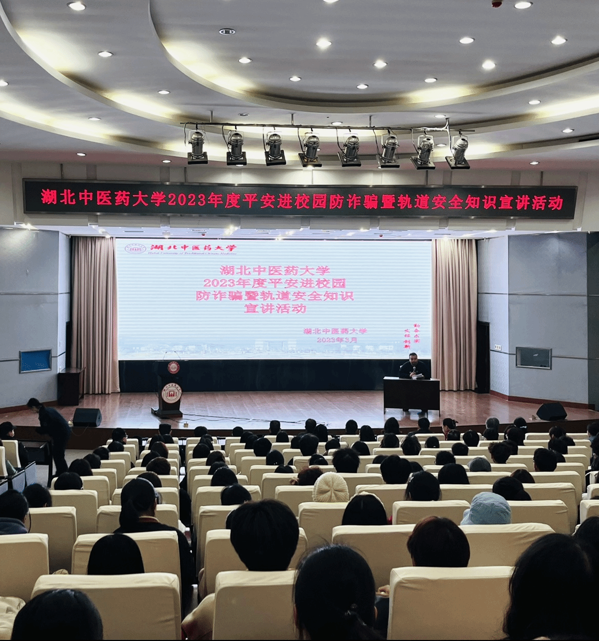 本网讯 3月16日,学生工作部、保卫处、财务处联合邀请武汉市公安局轨道分局民警和中国工商银行武汉白沙洲支行工作人员来校,在黄家湖校区明德楼学术报告厅开展安全主题讲座,为350余名师生带来一堂别开生面的“平安进校园--防诈骗暨轨道安全知识宣讲”课程。