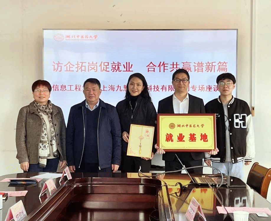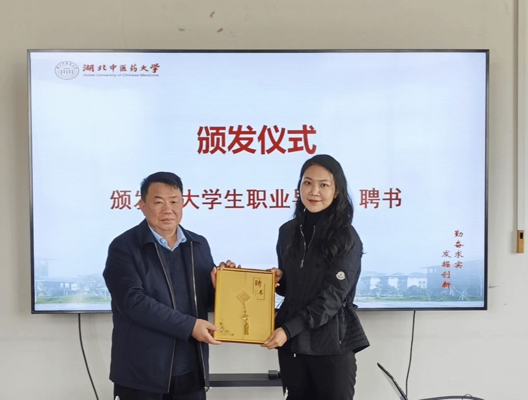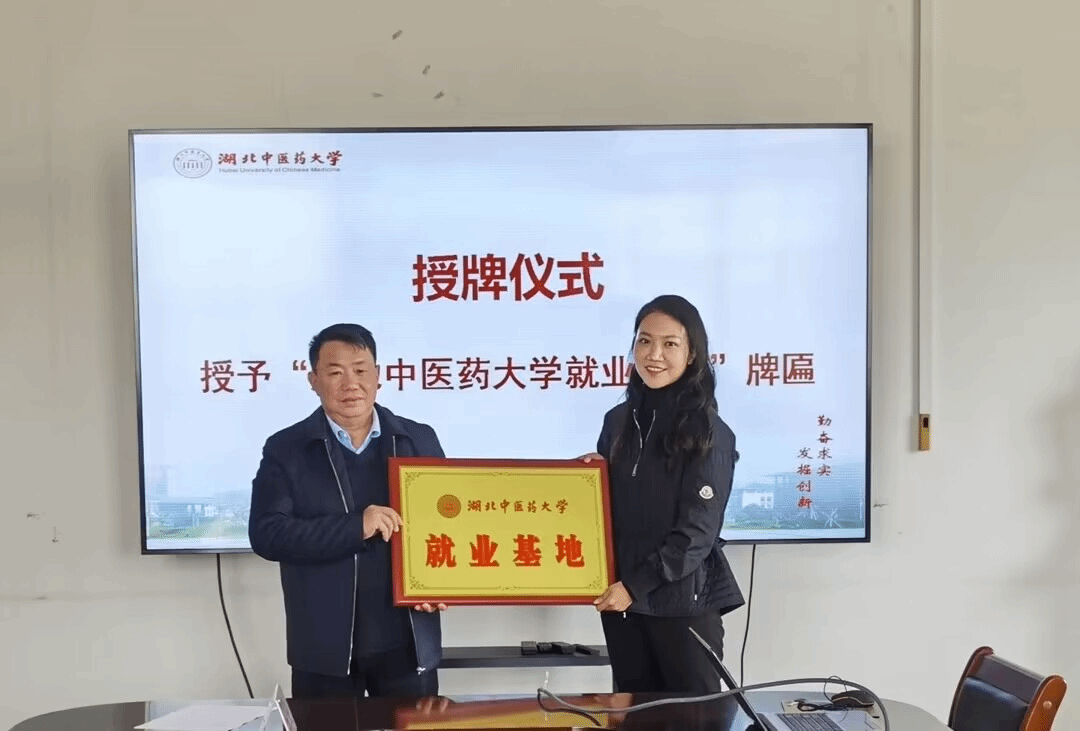 副校长何绍斌为公司授予“湖北中医药大学就业基地”牌匾,并颁发“大学生职业导师”荣誉聘书