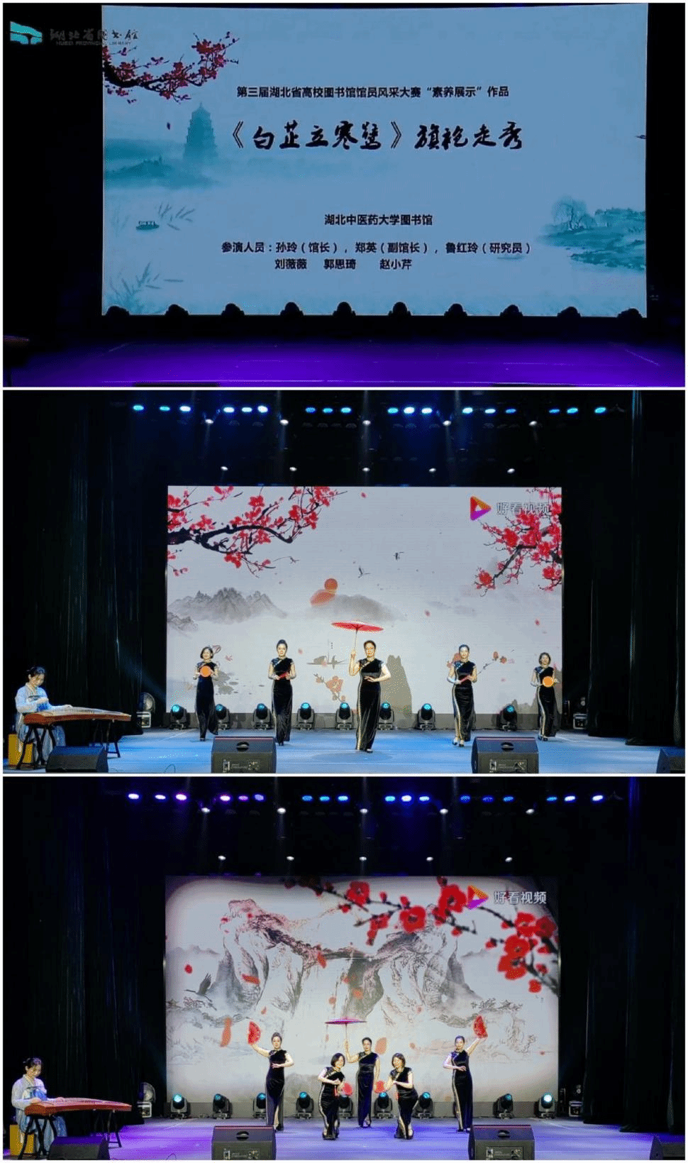本网讯 3月20日,由湖北省图书馆学会主办的“新时代图书馆高质量发展——全省图书馆员风采大赛决赛”在湖北省图书馆长江报告厅举行。省内公共图书馆、高校图书馆、科研院所图书馆等100余家单位参加比赛。我校图书馆展示节目《白芷立寒鹭》旗袍走秀获二等奖。