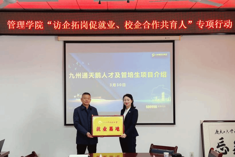 现场,胡少萍向九州通医药集团股份有限公司授予“湖北中医药大学就业基地”牌匾,管理学院负责人、校团委相关负责人向企业工作人员颁发“大学生职业导师”聘书。