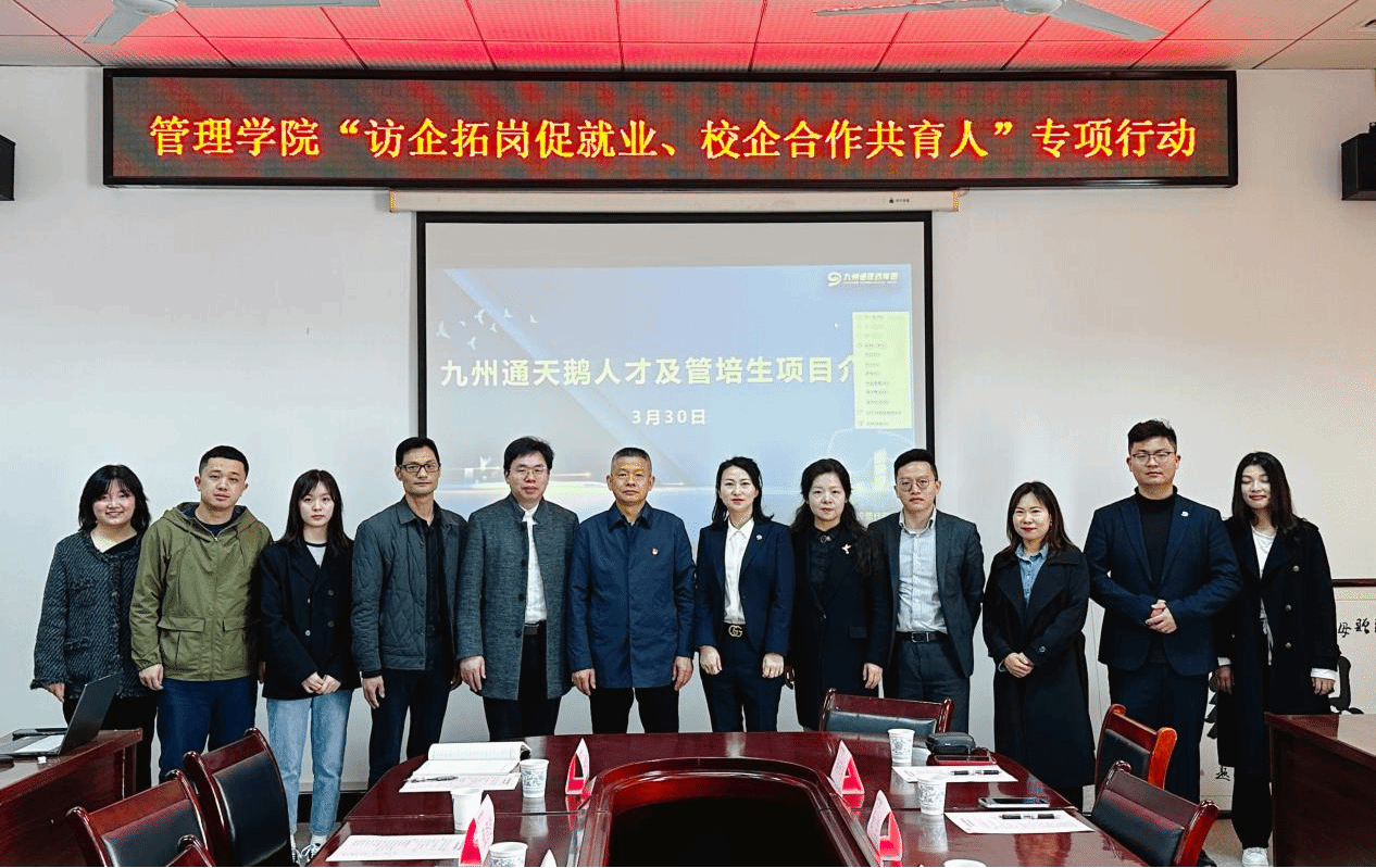 本网讯 为进一步加强校企合作、促进毕业生就业创业工作顺利开展,3月30日,管理学院邀请九州通医药集团股份有限公司集团分销事业部总经理罗德芳一行来校,在文华楼5楼会议室开展“访企拓岗促就业、校企合作共育人”专项活动,校纪委书记、监察专员胡少萍,校团委相关负责人,管理学院党政领导班子、毕业班辅导员参加活动。