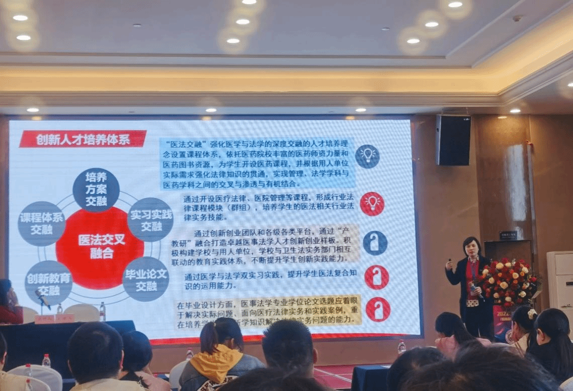 赵敏教授作为湖北卫生法学会副会长,作了题为“新文科背景下医法交融的医事法人才培养创新实践与思考”的主旨发言。陈冰副教授、赵敏教授论文《基于教学素材视角的高校<卫生法学>课程思政教学思考》获本次学术年会征文一等奖。