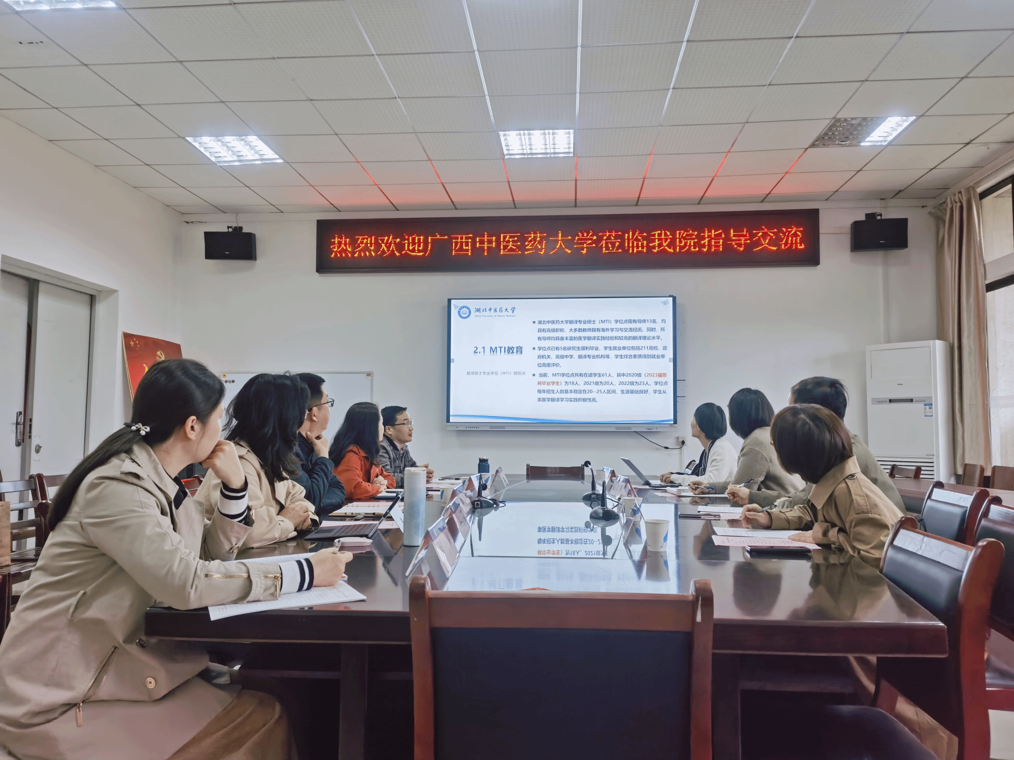 本网讯 4月24日,广西中医药大学外语部主任陈立群一行6人来我校外国语学院考察调研,外国语学院党政领导班子、MTI中心教师等参加调研会。