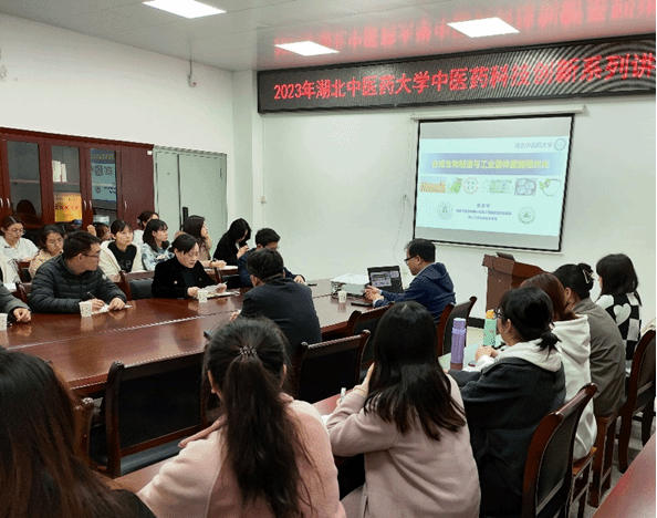 本网讯 4月24日,科学技术处举办第三期中医药科技创新系列讲座,邀请湖北大学生命科学学院杨世辉教授来校,在黄家湖校区杏林阁D103会议室作题为“合成生物制造与工业菌株重编程优化”的讲座,科学技术处负责人主持讲座,相关学院师生聆听讲座。