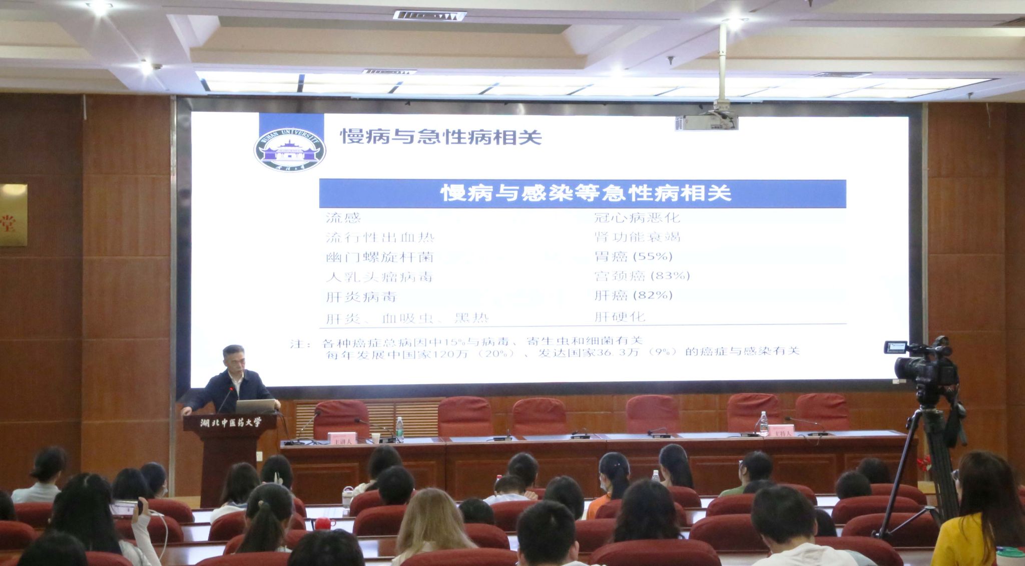 讲座中,唐其柱教授从慢病的严峻形势与危害引入,阐释了健康的生活方式、先进的医学科技、有效的保障体系对健康长寿的作用,介绍了国家“以人民健康为中心”,布局国家慢病防控战略的举措。唐其柱教授介绍了他主持的国家重点研发计划项目及团队在慢病防治领域的探索成果,即首创的慢病综合“六级防控”新理论,构建的“1+N”慢病综合防控集成技术方案,建立的慢病健康管理服务标准体系、慢病信息数据平台,“五位一体”慢病防控技术的实施与协同机制及其在中南地区的推广应用,让在场师生耳目一新。此外,他还分享了使用中药开展心肌重构等研究成果,充分肯定了中医药在疾病防治中的优势和作用,并带领大家展望当下智慧医疗的价值和前景。