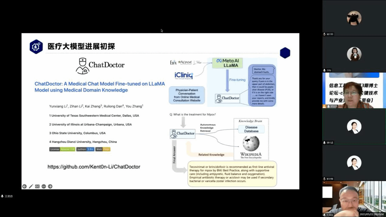 本网讯 5月22日,信息工程学院第3期博士论坛通过腾讯会议举行,邀请同济大学特聘研究员王昊奋教授作题为“ChatGPT关键技术与产业落地浅析”的报告。信息工程学院负责人主持报告会,学院100余名师生参会。
