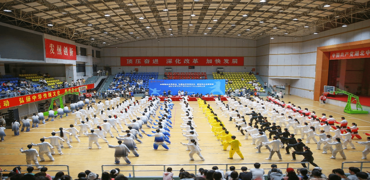 本网讯 5月25日,学校第五届大学生太极拳比赛在黄家湖校区体育馆举行。本次比赛由校团委、学生工作部、体育健康学院联合举办,各学院十三支代表队近1000名同学参加比赛。校党委常委曹继刚出席活动,校团委、各学院相关负责人、分团委书记以及学生代表2000余人观看比赛。