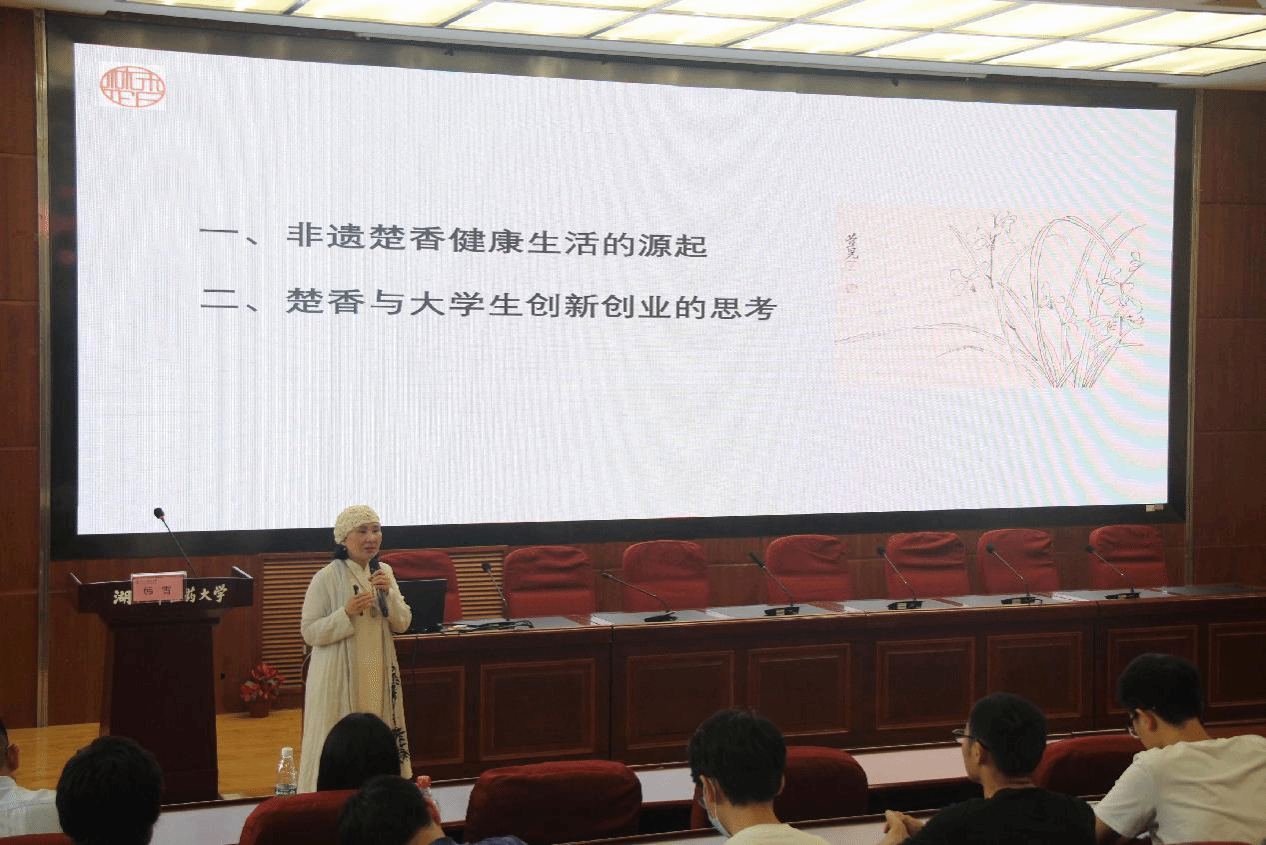 活动伊始,黄必胜为韩雪、周慧、陈述杰颁发湖北中医药大学创新创业导师荣誉聘书。随后,韩雪以“楚香健康生活与大学生创业发展”为题,结合楚香文化和产品研究经验,图文并茂地从非遗楚香健康生活的起源、楚香与大学生创新创业的思考两个方面,讲述了楚香文化的历史,养生香对应节气运用四气五味对五脏六腑的服气调节,分享了关于大学生创新创业教育与产品研发方面的思考。