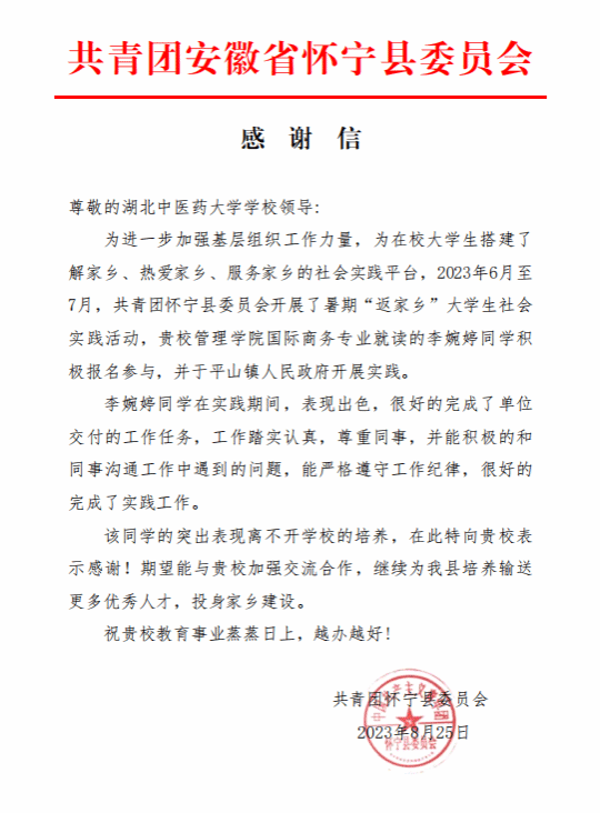 本网讯 近日,共青团怀宁县委员会向我校发来感谢信,信中提到,我校管理学院国际商务专业李婉婷同学于今年6月至7月积极报名参加暑期“返家乡”大学生社会实践活动,在怀宁县平山镇人民政府开展实践,期间严格遵守工作纪律,踏实认真、表现出色,较好完成了单位交付的工作任务。