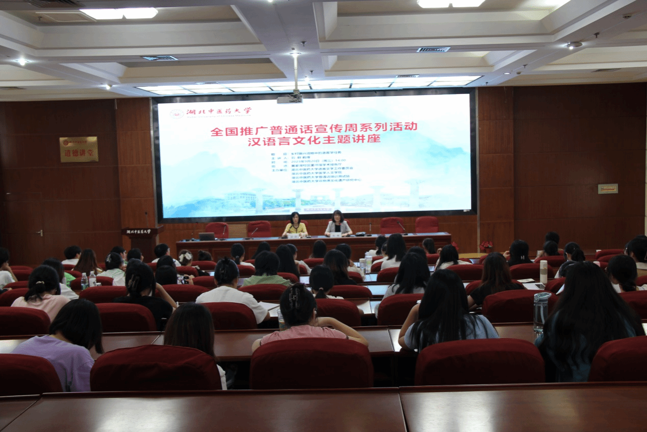 本网讯 为进一步推广普通话,传承弘扬中华优秀语言文化,9月20日,由学校语言文字工作委员会主办,医学人文学院承办的汉语言文化主题讲座在黄家湖校区图书馆学术报告厅举行。湖北文理学院文学与传媒学院院长刘群教授应邀来校,以“乡村振兴战略中的语言学任务”为题作了精彩分享。医学人文学院党委负责人主持讲座,医学人文学院、外国语学院近两百名师生聆听讲座。本次活动为学校2023年度宣传推广普通话系列活动之一。