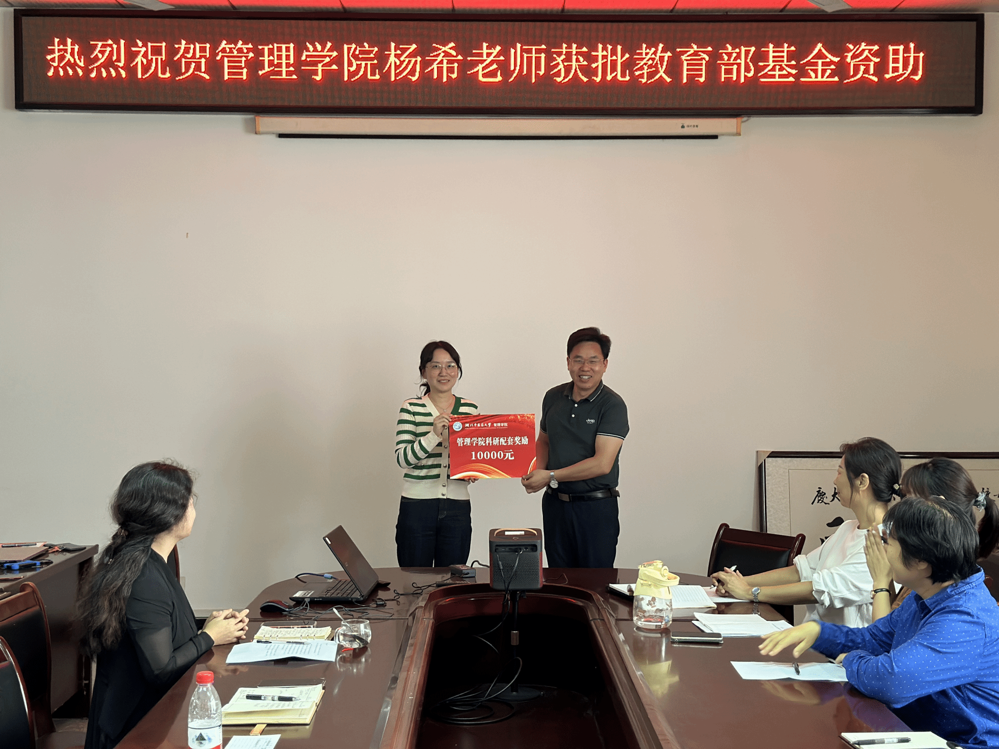 会议对2023年学院国家级课题申报情况进行了通报。学院在教育部基金项目中获得新突破,这是学校实现组织科研举措的结晶,也是全体教职工努力的结果。学院为教育部基金获得者杨希老师给予10000元的科研经费配套奖励,以鼓励全院教师在科研方面再创佳绩。