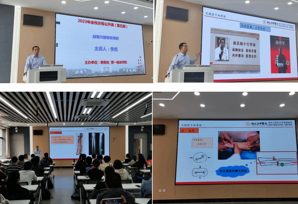 本次公开课内容为《中医骨伤科学》课程第六章第二节上肢骨折——尺桡骨干双骨折,第一临床学院中医骨伤科学专业教研室李浩老师通过线上、线下混合式教学模式讲授。他从该病种的解剖、病因病机、诊察要点及整复固定治疗方法四个方面进行讲授,提出“尺桡骨干双骨折是中医骨伤学的优势病种,中医治疗具有经验丰富、疗效确切的优势”论点,并着重讲述了中医正骨的历史渊源、原则及“拔伸牵引”“夹挤分骨”“折顶回旋”“端挤提按”等手法复位的方式,体现了极强的专业性,又不失一定的通俗性。李浩老师结合当前尺桡骨干双骨折临床诊疗中出现的延迟愈合、不愈合、畸形愈合、功能恢复差、并发症复杂等问题,通过参与式讨论学习,提出了中医骨伤科学的临床优势,强调临床治疗要重点考虑前臂旋转功能的恢复。他围绕中医特色、临床实践、治疗技术发展与传承等方面,介绍了近代以来中医骨伤领域发展历程以及行业新动向,系统学习临床疾病诊治,提升了学习动力和教学效果。