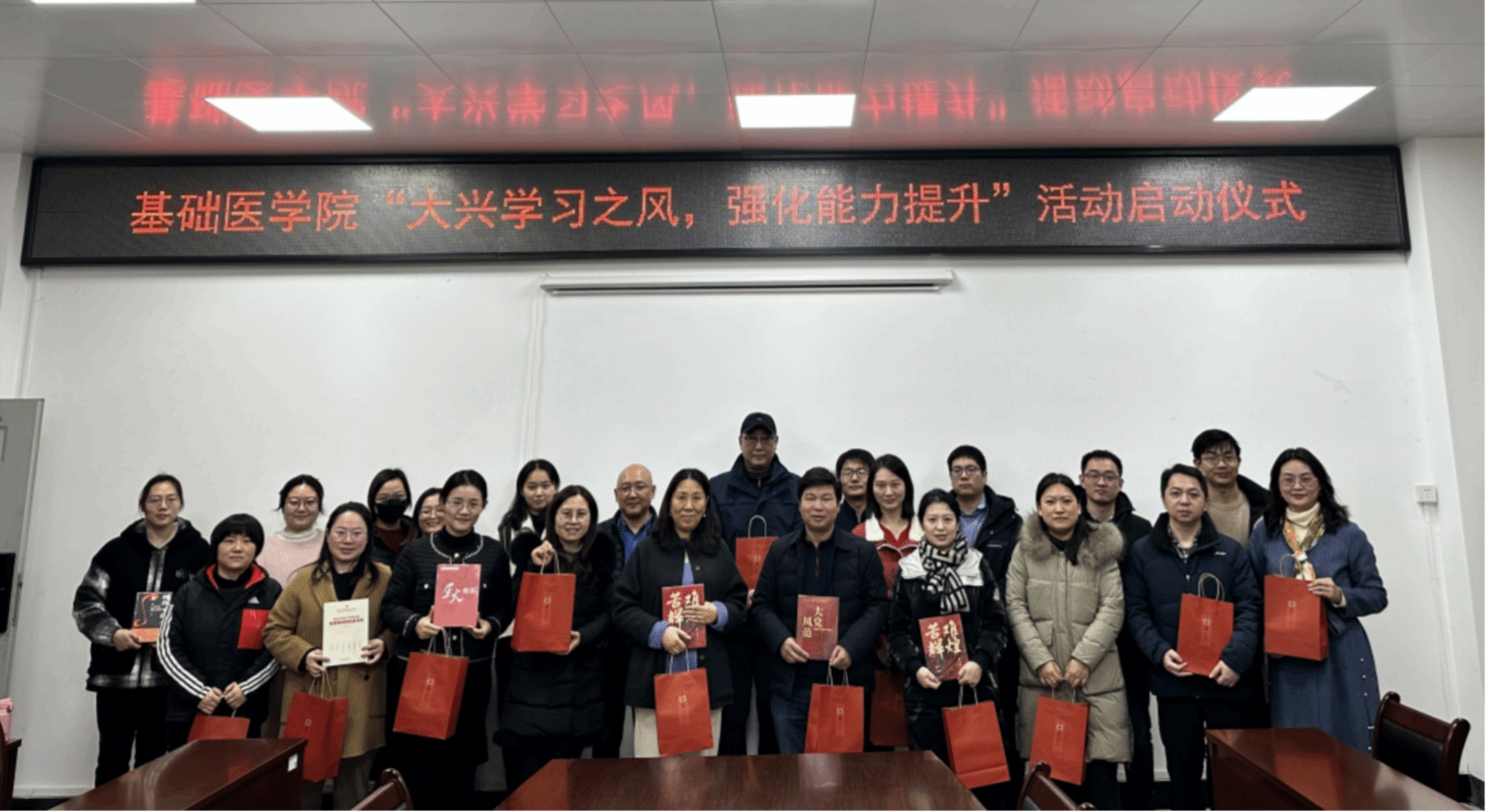 本网讯 为巩固拓展主题教育成果,健全以学铸魂、以学增智、以学正风、以学促干长效机制,1月12日,基础医学院在黄家湖校区杏林阁D103举行“大兴学习之风 强化能力提升”活动启动仪式,旨在通过开展读书学习、组织专题讲座、举行交流研讨、表彰先进典型等形式,引导教职工不断提升政治判断力、政治领悟力、政治执行力,锻造高强本领,以更加奋发有为的精神状态助力学院高质量发展。学院领导班子、教研室主任、党支部书记、“两代表一委员”、人才专家代表参加活动。启动仪式由基础医学院党委负责人主持。