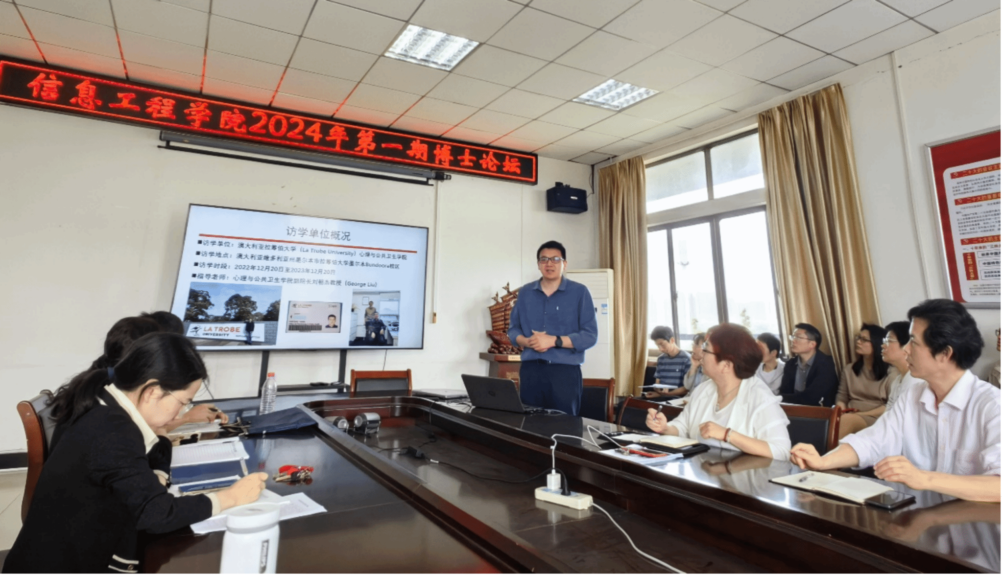 本网讯 近日,信息工程学院在思远楼学院会议室举办2024年第一期博士论坛暨出国访学教师报告会。信息管理与信息系统教研室杨海丰老师汇报了2023年在澳大利亚维多利亚州墨尔本市拉筹伯大学(La Trobe University)心理与公共卫生学院出国访学的基本情况、收获和体会。全院教职工参加报告会。