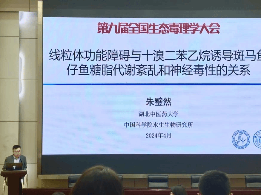 朱璧然教授担任第一专题会场主持人,就最新研究进展进行口头汇报,获得了同行专家的一致好评。陈香霖在大会研究生论坛作了题为“暴露于聚苯乙烯纳米塑料的斑马鱼幼体肠道微生物群与代谢物之间的相互作用”的报告。
