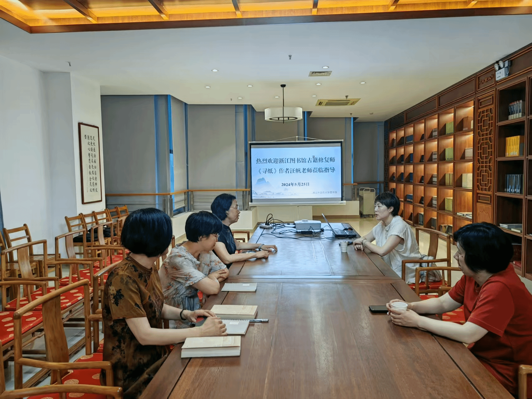 本网讯 5月25日,浙江图书馆(浙江省古籍保护中心)资深古籍修复专家、国家古籍修复技艺中心浙江传习所助理导师、《寻纸》作者汪帆,浙江图书馆古籍修复专家金琪应邀来校,参观指导古籍修复工作。图书馆负责人、古籍特藏部馆员参与交流。