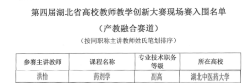 本网讯 6月6日,第四届湖北省高校教师教学创新大赛组委会发布现场赛入围名单,我校药学院《药剂学》(主讲教师:洪怡)入围产教融合赛道现场评审。