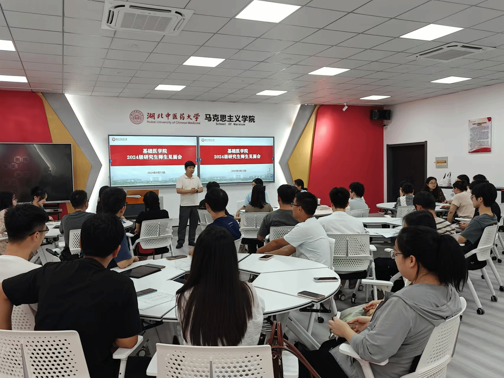本网讯 9月12日,基础医学院2024级研究生师生见面交流会在黄家湖校区杏林阁J208党建智慧教室召开。基础医学院领导班子成员、研究生导师代表、研究生教学秘书、研究生辅导员及2024级全体硕士、博士研究生参加活动。师生见面交流会由学院相关负责人主持。