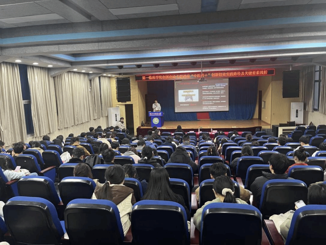 本网讯 为培养学生的创新精神和实践能力,3月13日,第一临床学院在昙华林校区学术报告厅以线上线下相结合的方式举办创新创业专题讲座暨“挑战杯”大学生课外学术科技作品竞赛院赛。针灸骨伤学院张晓林副教授应邀作“‘中医药+’创新创业实践路径及关键要素浅析”专题报告。张晓林副教授及检验学院创新创业赛事指导老师钟鑫担任院赛评委。第一临床学院300余名师生聆听讲座并观摩比赛。