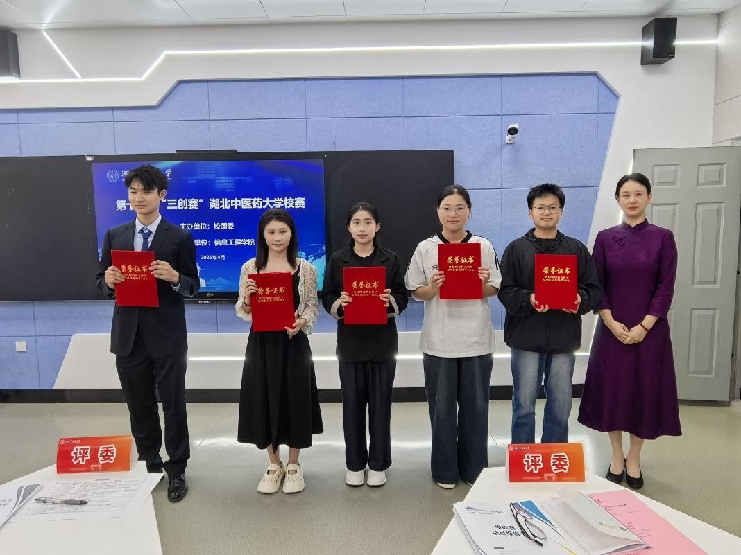 本届“三创赛”收到报名项目100余项,18个项目进入校级决赛。决赛采用“路演+专家提问”模式进行。参赛团队从项目背景、核心技术、市场需求、财务分析等多方面进行了路演介绍。评委老师综合项目创新能力、商业策划、市场可行性分析、项目意义等方面进行了点评和指导。经过激烈比拼,“时珍物语-荆楚中医药文化的推广者”、“杏林智荟 非遗数潮——中医药融汇非遗数字孪生文创生态构建者”2个项目获得特等奖;“AI面诊食疗推荐系统”等3个项目获得一等奖;“子期足浴”等5个项目获得二等奖;“全民健康——不治已病治未病”等8个项目获得三等奖。专家评委为获奖团队现场颁奖。