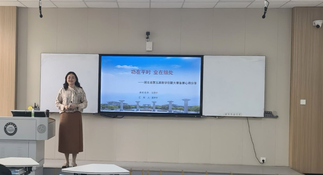 吴丰华教授以“功在平时,业在细处”为题,分享了备战湖北省第五届教学创新大赛的心路历程。她和团队以《生理学》课程为载体,通过系统规划、集体协作和专家指导,逐步优化教学创新成果报告。团队从校赛一等奖到省赛决赛,先后吸纳了华中师范大学、华中农业大学教学专家意见建议,针对教学特色、逻辑线条、数据支撑等问题进行了多轮修改与打磨,最终形成了“虚实一体、中西结合”的创新报告。