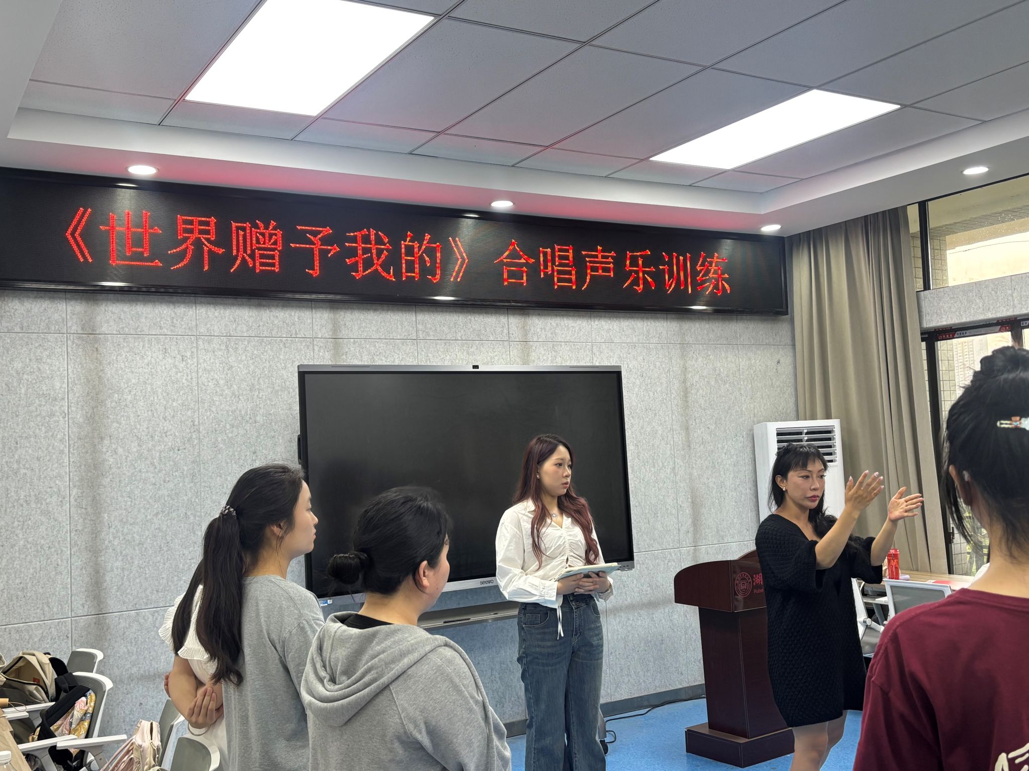本网讯 4月18日,护理学院在黄家湖校区惠风轩智慧教室举办声乐团培训,邀请中南财经政法大学陈春英副教授现场指导,并量身定制《世界赠予我的》合唱声乐培训计划。护理学院合唱团成员参加活动。