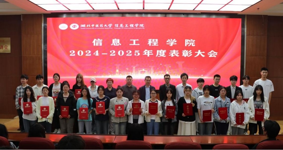 信息工程学院负责人宣读《信息工程学院关于表彰2024-2025年度学生先进集体、先进个人的决定》,希望受表彰的集体和个人再接再厉,取得新成绩。学院创新创业指导教师肖瑞寄语同学们以学科竞赛为契机,把对中医药的热爱转化为创新动力,为中医药事业腾飞插上信息技术的翅膀。第十九届全国大学生智能汽车竞赛一等奖获得者王家俊分享了备赛经历,号召同学们勇于创新、坚持到底。与会领导为获得表彰的同学颁发荣誉证书,并合影留念。