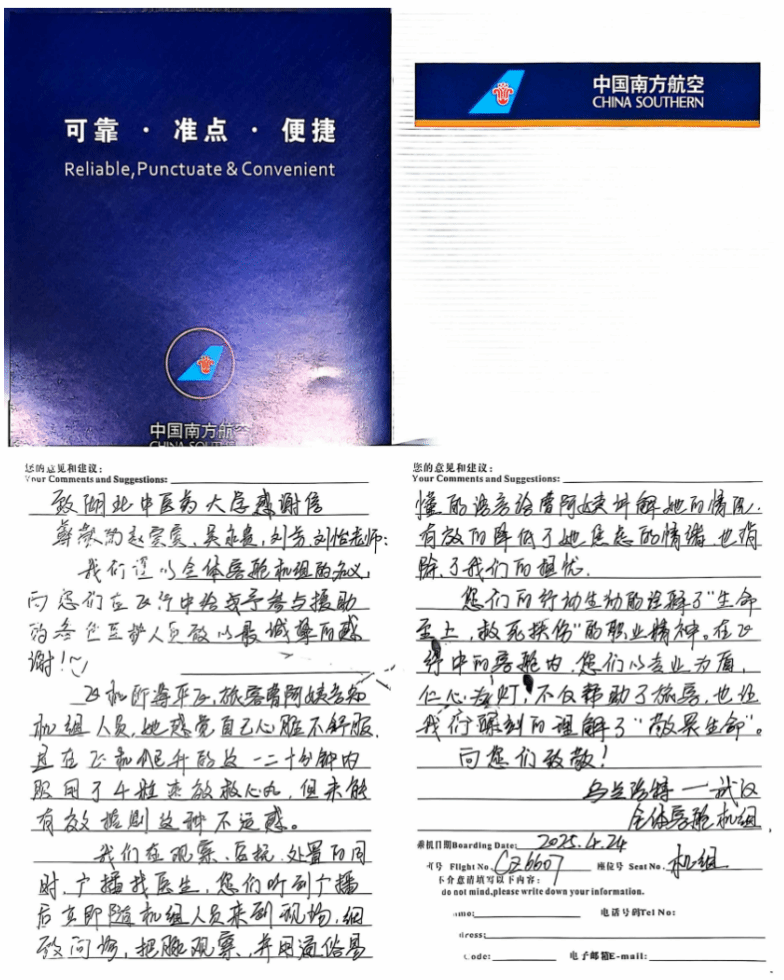 本网讯 日前,在乌兰浩特返回武汉的南方航空CZ6607航班上,一位乘客突发心慌胸闷不适,基础医学院赵宾宾教授、吴永贵副教授、博士后刘芳、科研助理刘怡一行4人联合机组人员及时救援,保障乘客平安抵达武汉。南方航空CZ6607班组特发感谢信,感谢我校师生在云海之上守护患者生命的暖心举措。