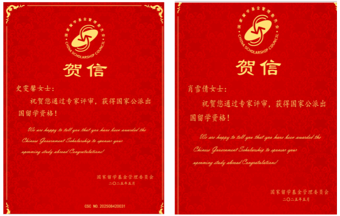 本网讯 5月26日,国家留学基金管理委员会公布了“2025年国家建设高水平大学公派研究生项目”录取结果。我校药学院硕士研究生史雯馨、检验学院硕士研究生肖雪倩分别获批公派赴西班牙格拉纳达大学、德国柏林工业大学攻读博士研究生。