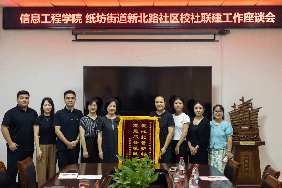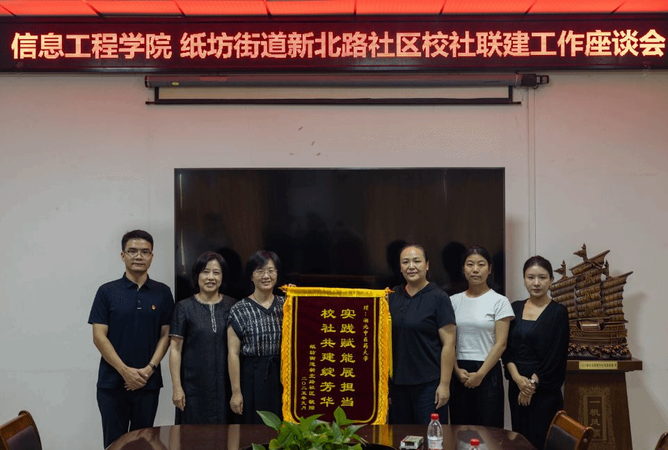 本网讯 9月12日,武汉市江夏区纸坊街道新北路社区党委书记、居委会主任况曼莉一行到访学校,向学校和信息工程学院暑期“三下乡”时珍志愿服务队赠送锦旗,感谢学校在“校社共建”和“七彩假期”志愿服务中的无私奉献和暖心服务。校团委负责人、信息工程学院领导班子成员及师生代表参加校社联建工作座谈会。信息工程学院党委负责人主持座谈会。