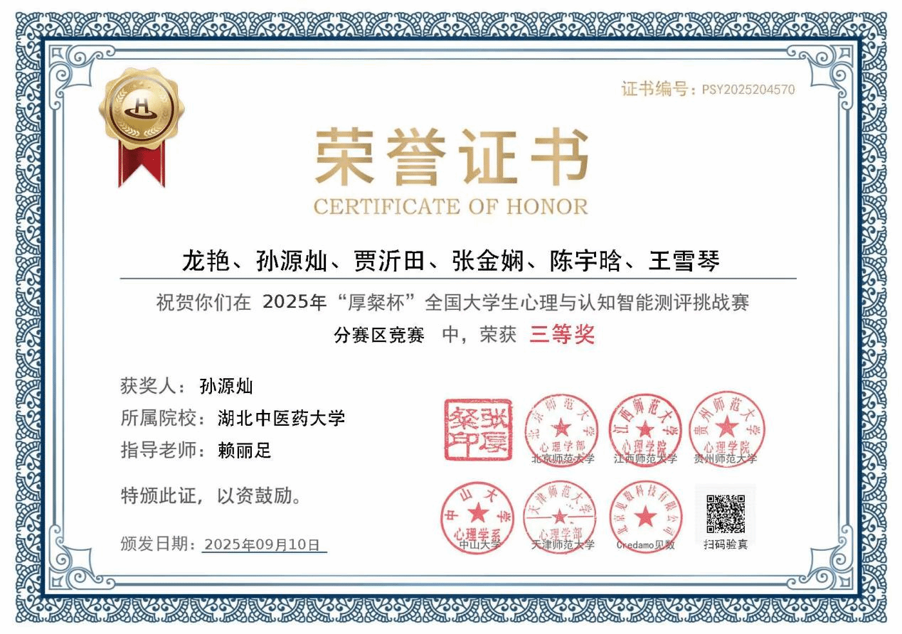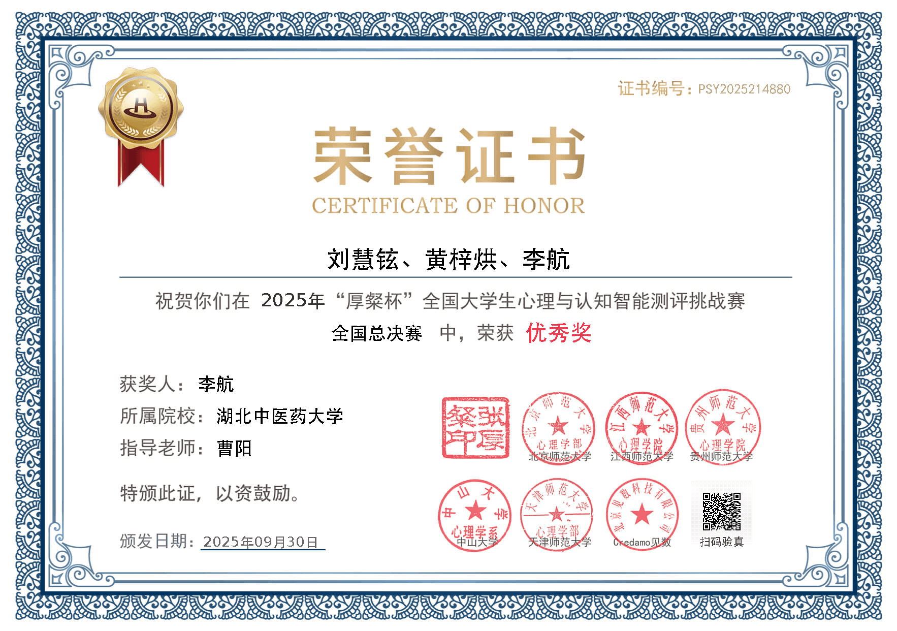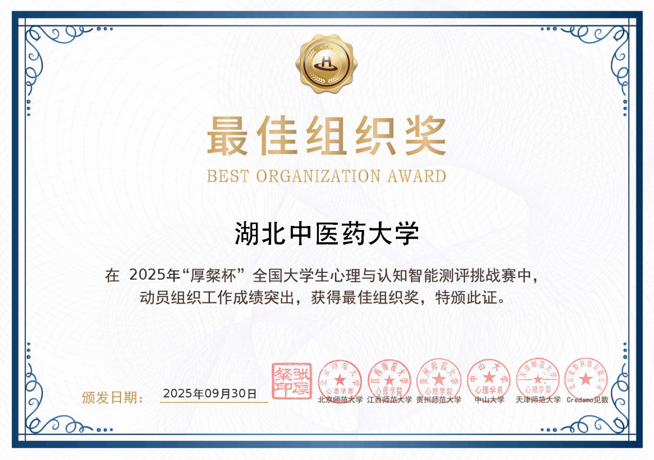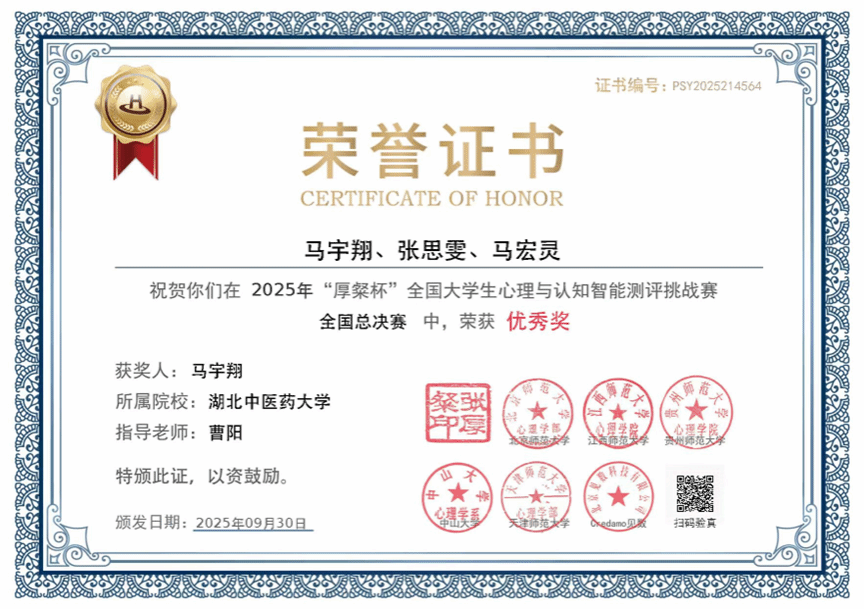 作为国内首个聚焦心理学与人工智能深度融合的国家级专项赛事,“厚粲杯”自2025年3月启动以来,吸引了来自全国31个省级行政区、378所高校的10025名学生报名参赛,累计提交作品1625份。在此次比赛中,我校医学人文学院师生以勤奋求实的科研态度和勇于创新的探索精神,在激烈的角逐中脱颖而出,充分展现了新时代中医药学子扎实的学术素养与卓越的科研能力。