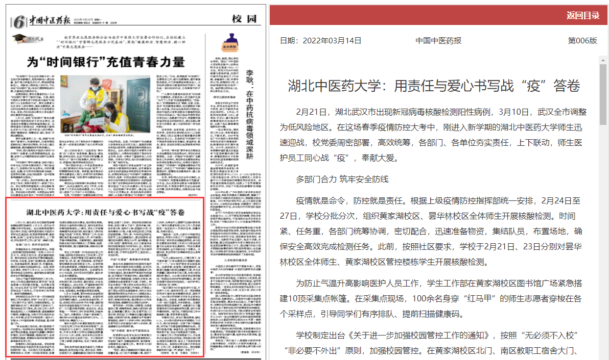 中国中医药报报道:湖北中医药大学:用责任与爱心书写战“疫”答卷