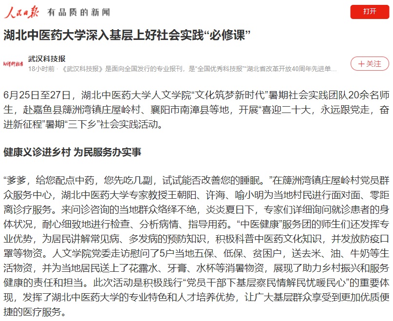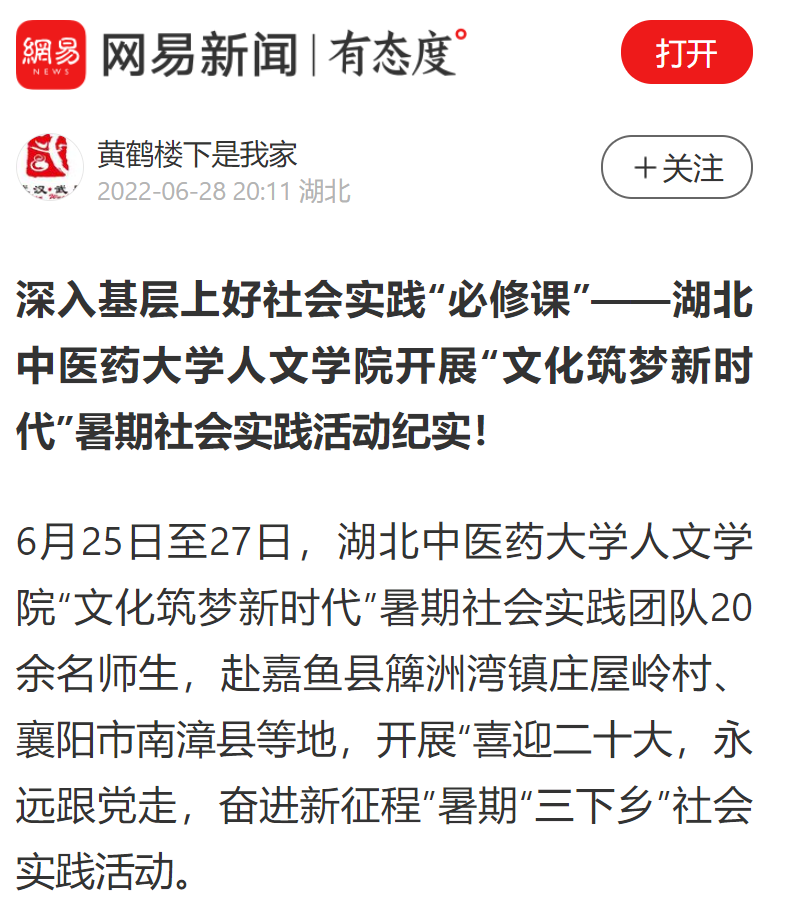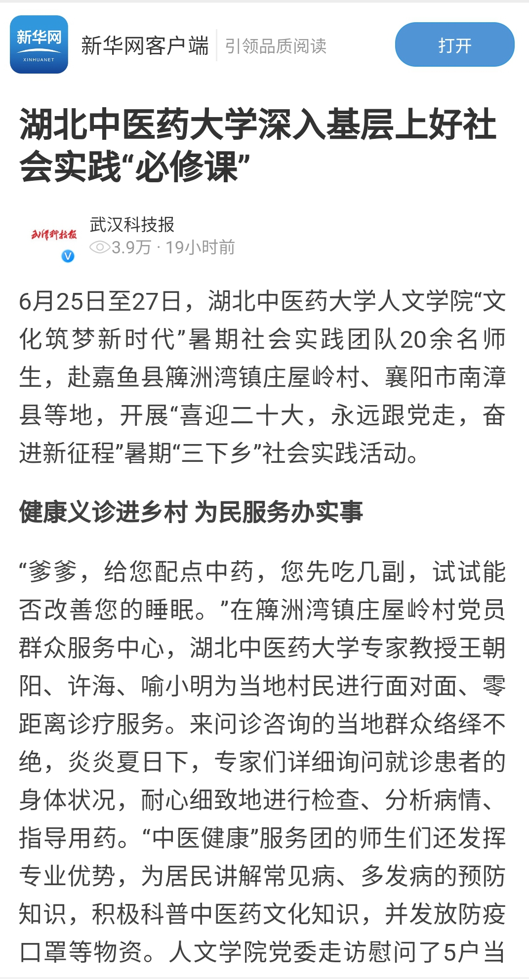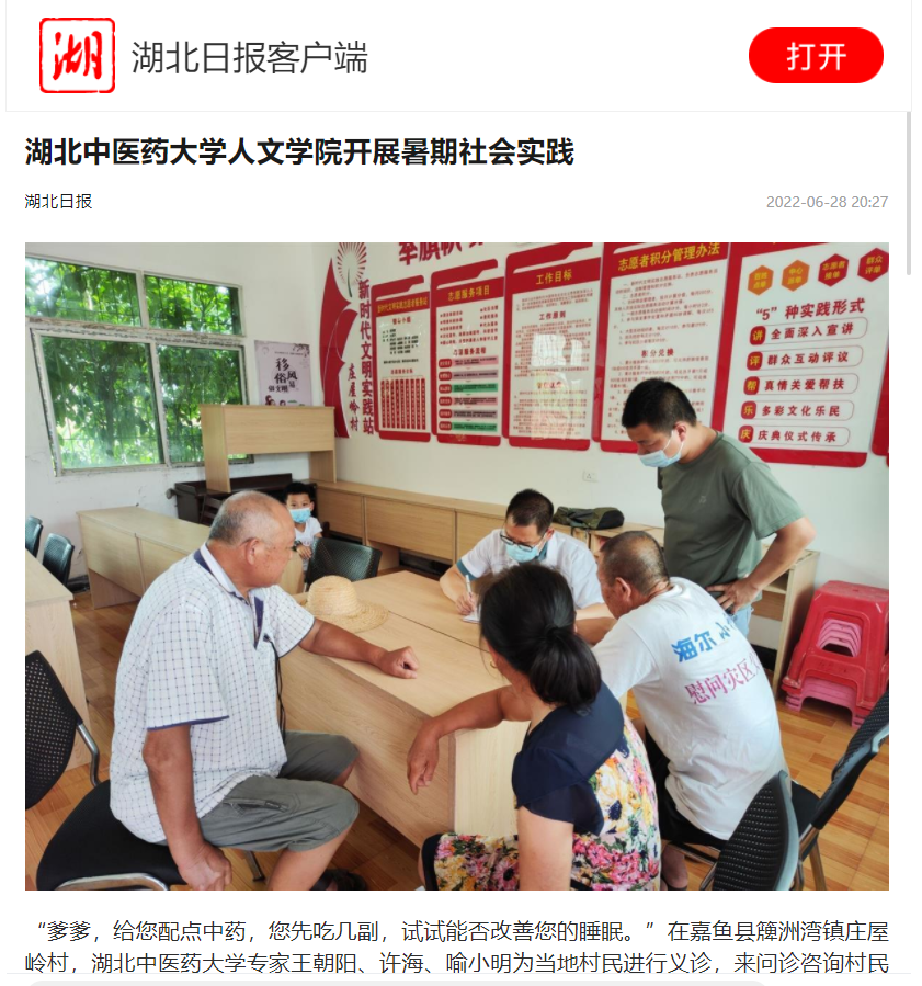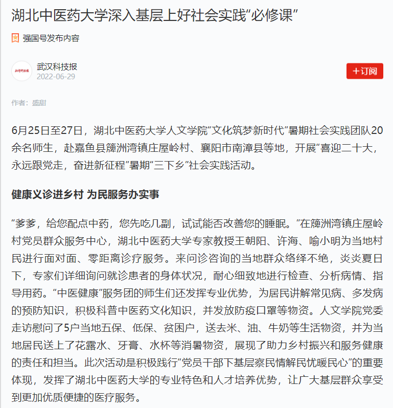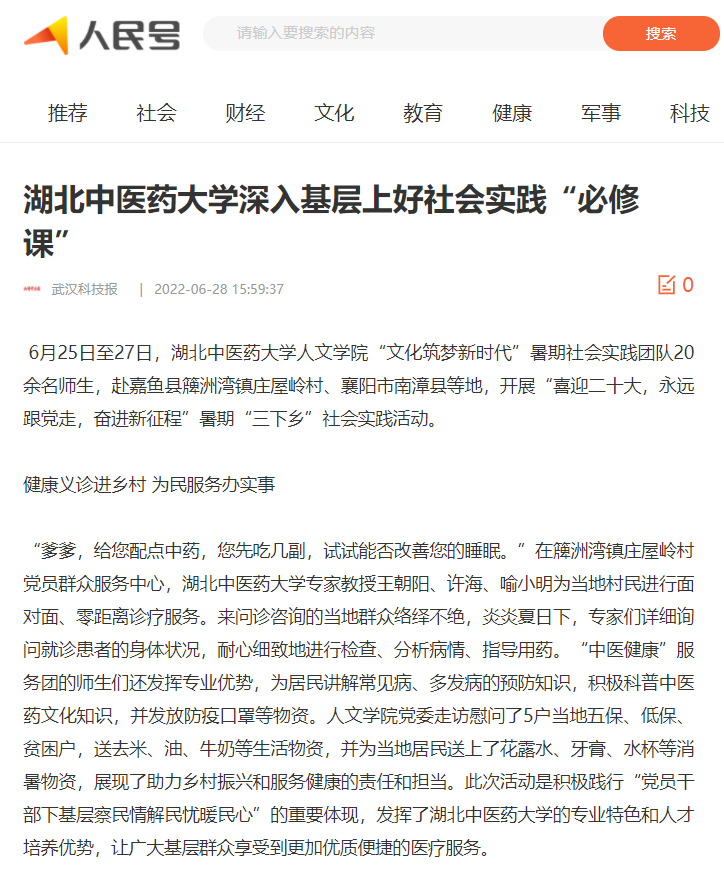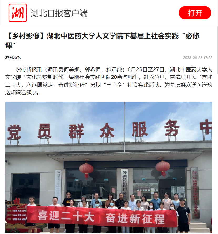下一条:新华网:湖北中医药大学外国语学院开展“喜迎二十大,永远跟党走,奋进新征程”暑期“三下乡”社会实践活动