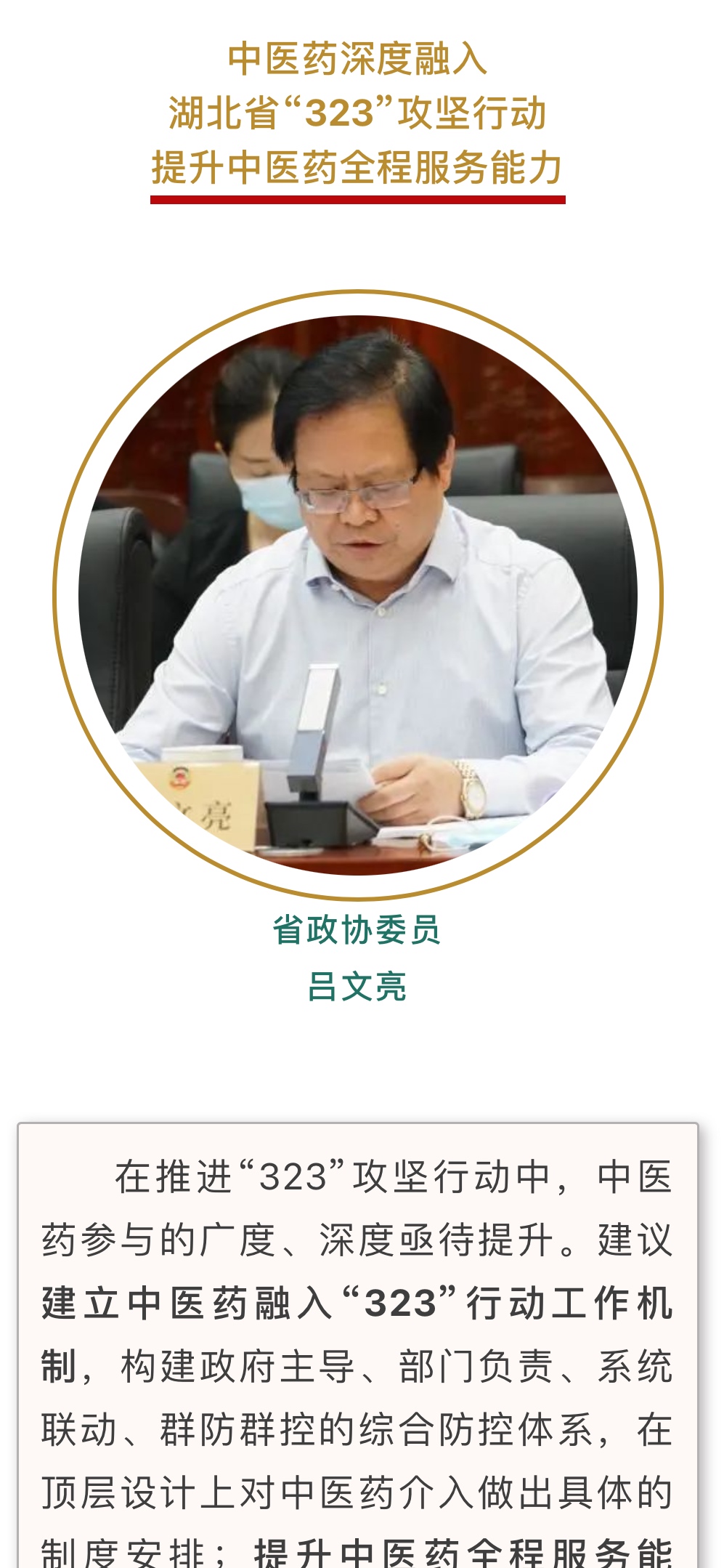 在推进“323”攻坚行动中,中医药参与的广度、深度亟待提升。建议建立中医药融入“323”行动工作机制,构建政府主导、部门负责、系统联动、群防群控的综合防控体系,在顶层设计上对中医药介入做出具体的制度安排;提升中医药全程服务能力,围绕中医特色的疾病预防体系、治疗体系和康复体系,形成若干支撑性项目,依托具体单位实施;加强中医药临床研究,支持中医医疗机构与高等院校、科研机构加强协作,支持湖北中医药大学附属湖北省中医院创建国家中医医学中心;加强基层中医药服务基地建设,使广大患者在基层医疗机构就能享受到三级医院医疗服务水平。