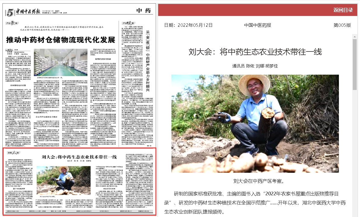 本网讯 5月12日,中国中医药报5版“中药人物”专栏以《刘大会:将中药生态农业技术带往一线》为题,对我校药学院刘大会教授扎根中药材生产一线,将论文写在祖国广袤大地上的奋进事迹做了详细报道。