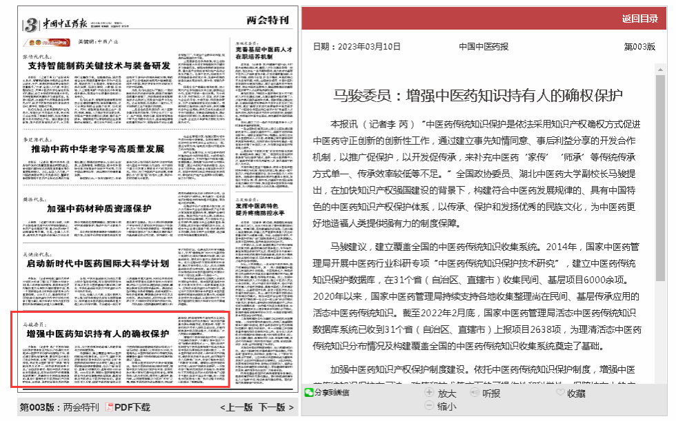 本网讯 2023年全国两会召开以来,全国政协委员、我校副校长马骏在京积极履职,为中医药事业发展建言献策。3月10日,中国中医药报“两会特刊”以《马骏委员:增强中医药知识持有人的确权保护》为题,刊发专题采访报道。
