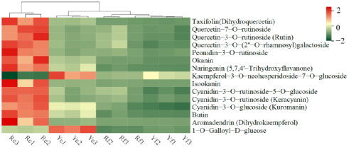 植物表观颜色的变化是其内在次生代谢产物变化的重要体现, 团队对红、黄半夏的主要化学成分总黄酮进行了含量测定,结果显示红半夏的总黄酮含量显著高于黄半夏,是黄半夏的1.6倍(图1C、D)。分别对红、黄半夏块茎的茎肉及表皮进行了花青素含量测定,结果显示红半夏块茎表皮的矢车菊素、天竺葵素含量显著高于黄半夏,表明这两种花青素是红半夏表皮呈红成的物质基础(图1E、F)。通过代谢组分析,进一步鉴定了二氢槲皮素、二氢山奈酚、柚皮素等15个黄酮类差异代谢产物,可作为红半夏的特征代谢产物(图2)。